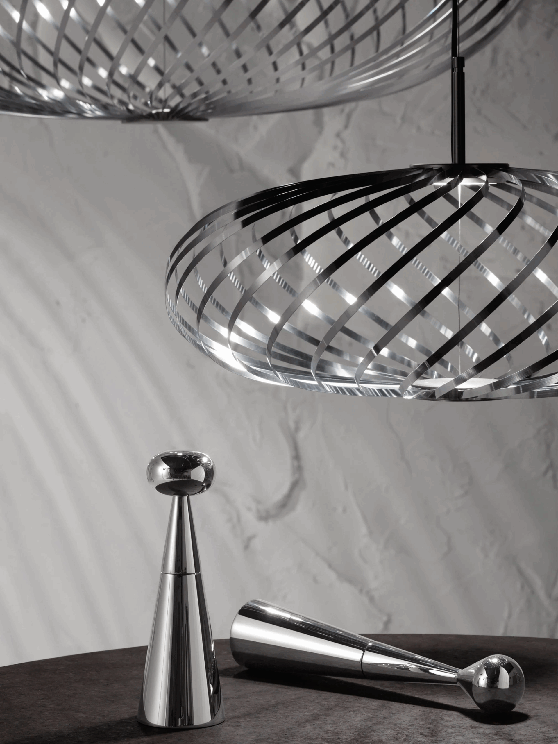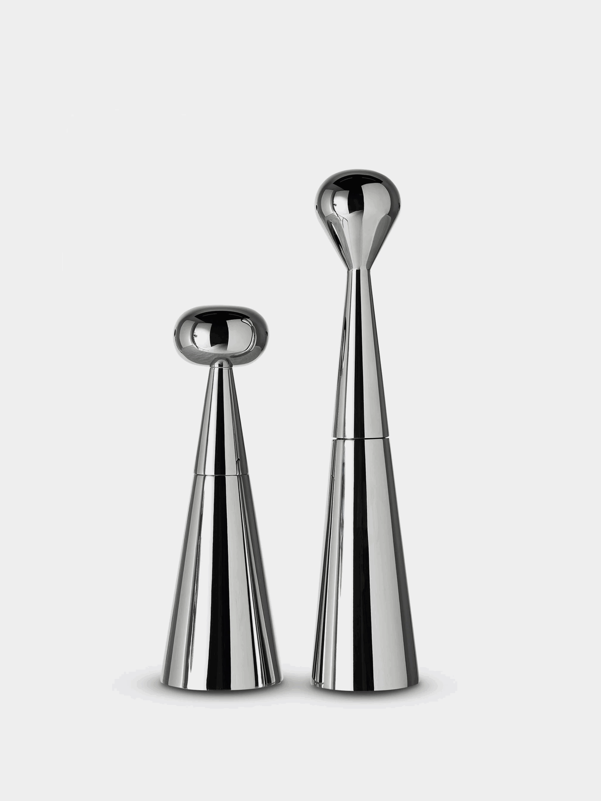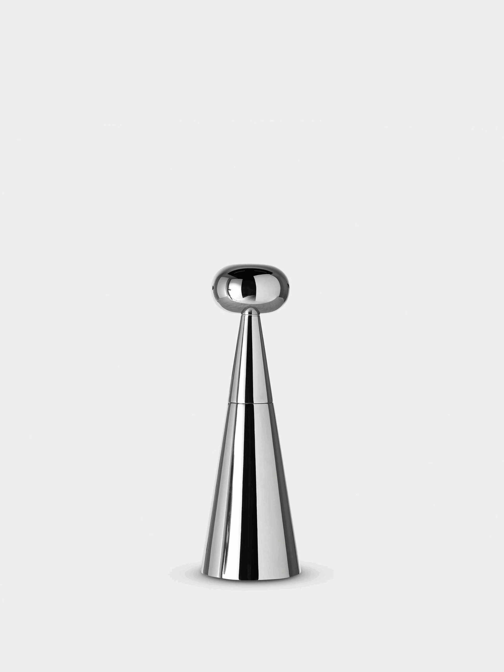 The Small Mill grinder features expressive handles and a sleek stainless steel conical design. Built for durability with an expert-developed mechanism, it meets catering quality standards, is easy to clean, and has interchangeable mechanisms.